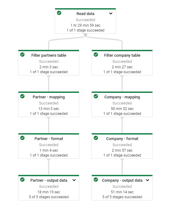 Nessa etapa foram criados dois datasets. Um raw com os fatos e dimensões (os arquivos das dimensões estão no git) e um trusted com uma tabela fato unificada das empresas e sócios e filtrada apenas com as empresas ativas.