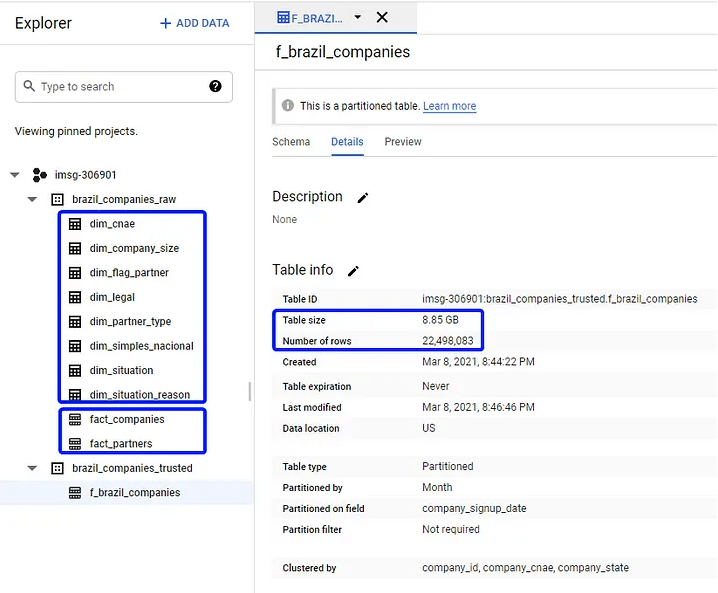 A tabela final possui quase 9GB e 22 milhões de linhas. Vale notar também que a tabela está particionada e clusterizada para ganhos de performance e redução de custos. Veja mais detalhes aqui.