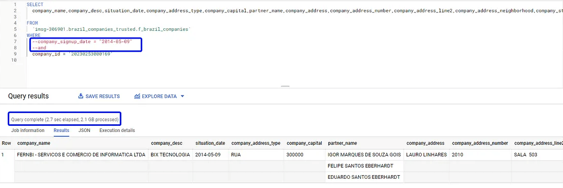 Legal né? Em uma tabela de 9GB com 22 milhões de registros, o Big Query precisou processar 2,1GB e em menos de 3 segundos retornou as informações de uma única empresa.