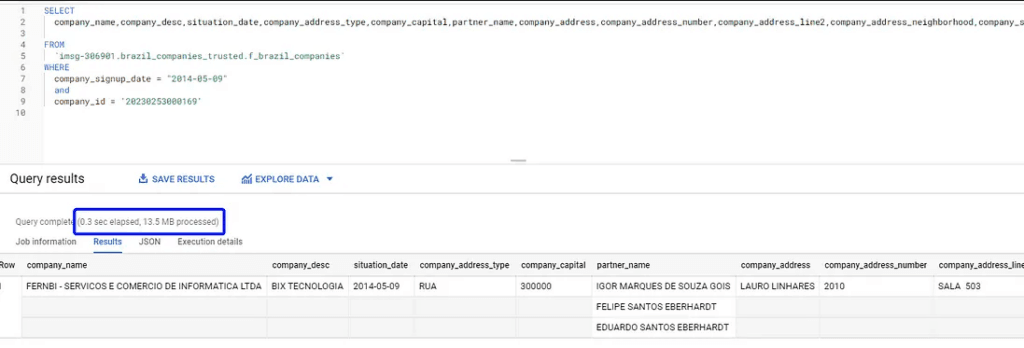 Note que a consulta com o filtro particionado levou apenas 0,3 segundos e apenas 13,5 MB para retornar os mesmos dados (isso não foi cache da consulta anterior!). Com isso, foi possível reduzir custos e melhorar a performance – bem vindo ao dia-a-dia da BIX!