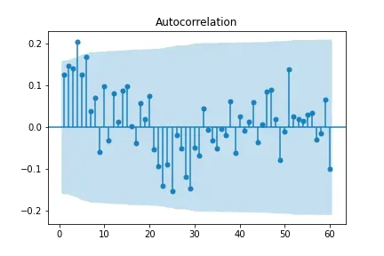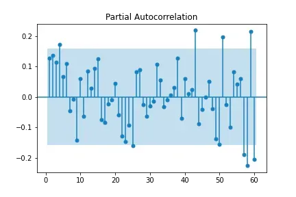 Os gráficos indicam que há correlação se existem pontos fora da região azul. Observando nosso resultado, vemos que não existe uma correlação muito discrepante entre os lags. Deste modo, também não iremos considerar o parâmetro p do modelo ARMA.
