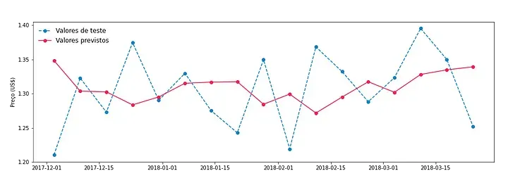A partir da figura, podemos ver que o resultado da predição não foge muito dos valores de teste, que de fato ocorreram. Porém, é interessante validar a eficácia do modelo de uma maneira menos qualitativa.