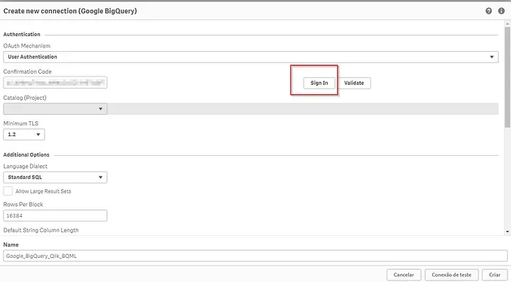 Nosso primeiro passo é tentar extraí-los no Qlik Sense criando uma nova conexão que aponta para o nosso dataset no BQ.