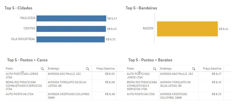 Na sequência, os gráficos de barras mostram os bairros e bandeiras com gasolina mais cara. A partir deles, podemos criar novos filtros e me aprofundar mais um nível na análise: digamos que você queira descobrir, por exemplo, como estão os preços dos postos da Raízen (Shell) considerando os bairros Centro, Paulicéia e Vila Industrial. O resultado é mostrado nos Top 5 a seguir: