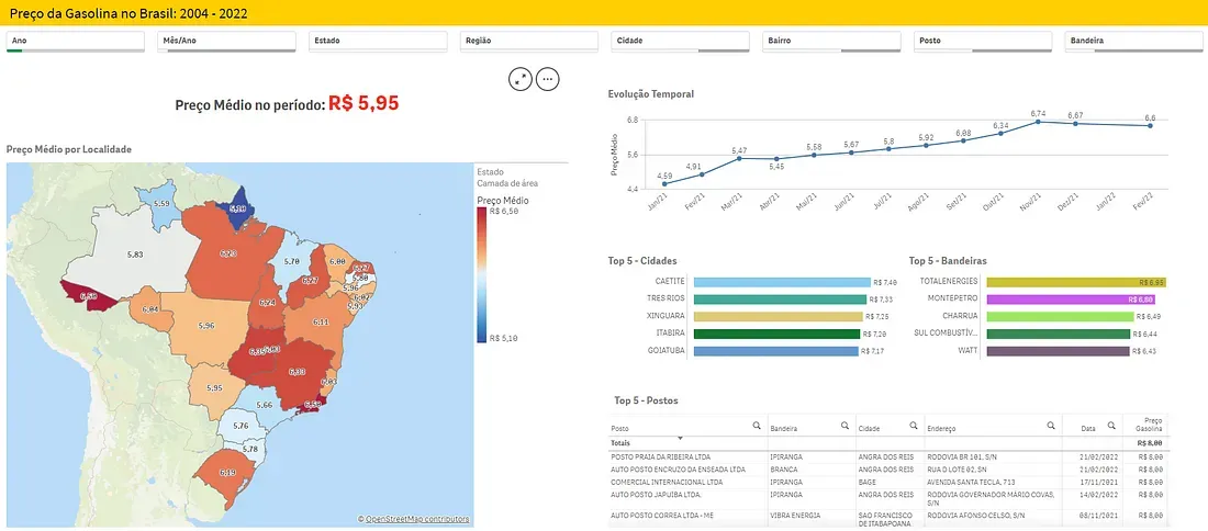 Veja o exemplo a seguir. Nele, foram usados filtros para um mesmo período de tempo e, na sequência, filtrou-se apenas o estado de Minas Gerais. Dessa forma, é possível ver que, dentre todas as cidades mineiras presentes na base de dados, foi Itabira que apresentou a gasolina mais cara, com um preço médio de R$ 7,20.